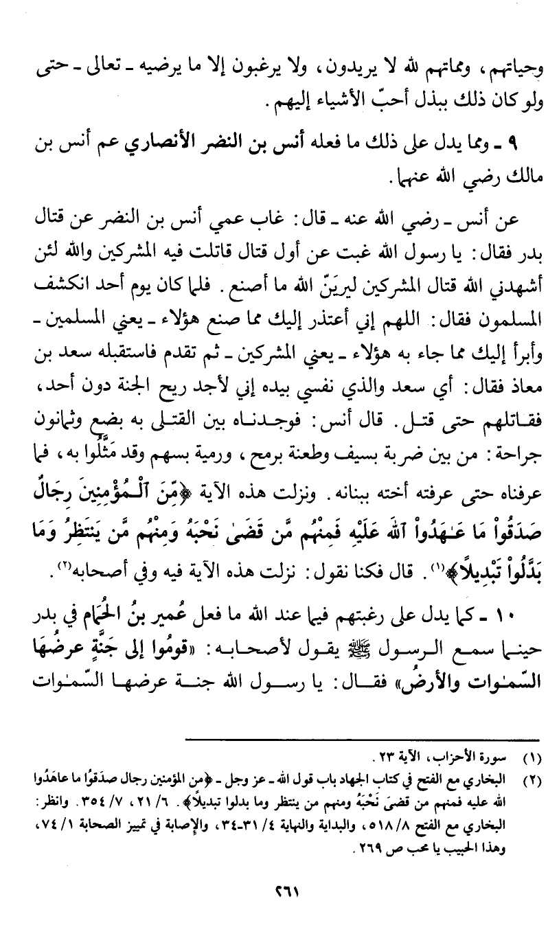 (¬2) البخاري مع الفتح في كتاب الجهاد باب قول الله - عز وجل - مِنَ الْمُؤْمِنِينَ رِجَالٌ صَدَقُوا مَا عَاهَدُوا اللَّه عَلَيْه فَمِنْهُمْ مَنْ قَضَى نَحْبَه وَمِنْهُمْ مَنْ يَنْتَظِرُ وَمَا بَدَّلُوا تَبْدِيلًا. 6/ 21، 7/ 354. وانظر: البخاري مع الفتح 8/ 518، والبداية والنهاية 4/ 31 - 34، والإصابة في تمييز الصحابة 1/ 74، وهذا الحبيب يا محب ص 269.