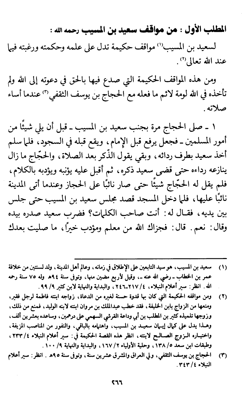 1 - صلى الحجاج مرة بجنب سعيد بن المسيب - قبل أن يلي شيئًا من أمور المسلمين - فجعل يرفع قبل الإِمام، ويقع قبله في السجود، فلما سلم أخذ سعيد بطرف ردائه، وبقي يقول الذّكر بعد الصلاة، والحجّاج ما زال ينازعه رداءه حتى قضى سعيد ذكره، ثم أقبل عليه يؤنبه ويؤدبه بالكلام، فلم يقل له الحجّاج شيئًا حتى صار نائبًا على الحجاز وعندما أتى المدينة نائبًا عليها، فلما دخل المسجد قصد مجلس سعيد بن المسيب حتى جلس بين يديه، فقال له: أنت صاحب الكلمات؟ فضرب سعيد صدره بيده وقال: نعم. قال: فجزاك الله من معلم ومؤدب خيرًا، ما صليت بعدك