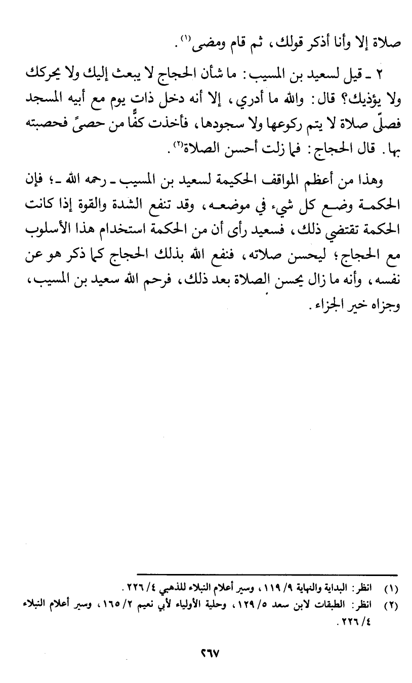 2 - قيل لسعيد بن المسيب: ما شأن الحجاج لا يبعث إليك ولا يحركك ولا يؤذيك؟ قال: والله ما أدري، إلا أنه دخل ذات يوم مع أبيه المسجد صلّى صلاة لا يتم ركوعها ولا سجودها، فأخذت كفّا من حصى فحصبته بها. قال الحجاج: فما زلت أحسن الصلاة (¬2).