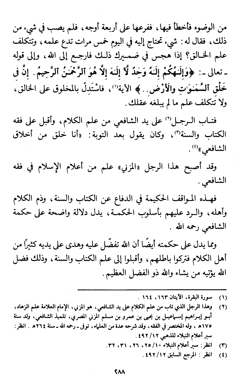 (¬2) وهذا الرجل الذي تاب من علم الكلام على يد الشافعي، هو المزني، الإمام العلامة علم الزهاد، أبو إبراهيم إسماعيل بن يحيى بن عمرو بن مسلم المزني المصري، تلميذ الشافعي، ولد سنة 175 هـ، وله المختصر في الفقه، وقد شرحه عدة من العلماء، توفي - رحمه الله - سنة 264 هـ. انظر: سير أعلام النبلاء للذهبي 12/ 492.