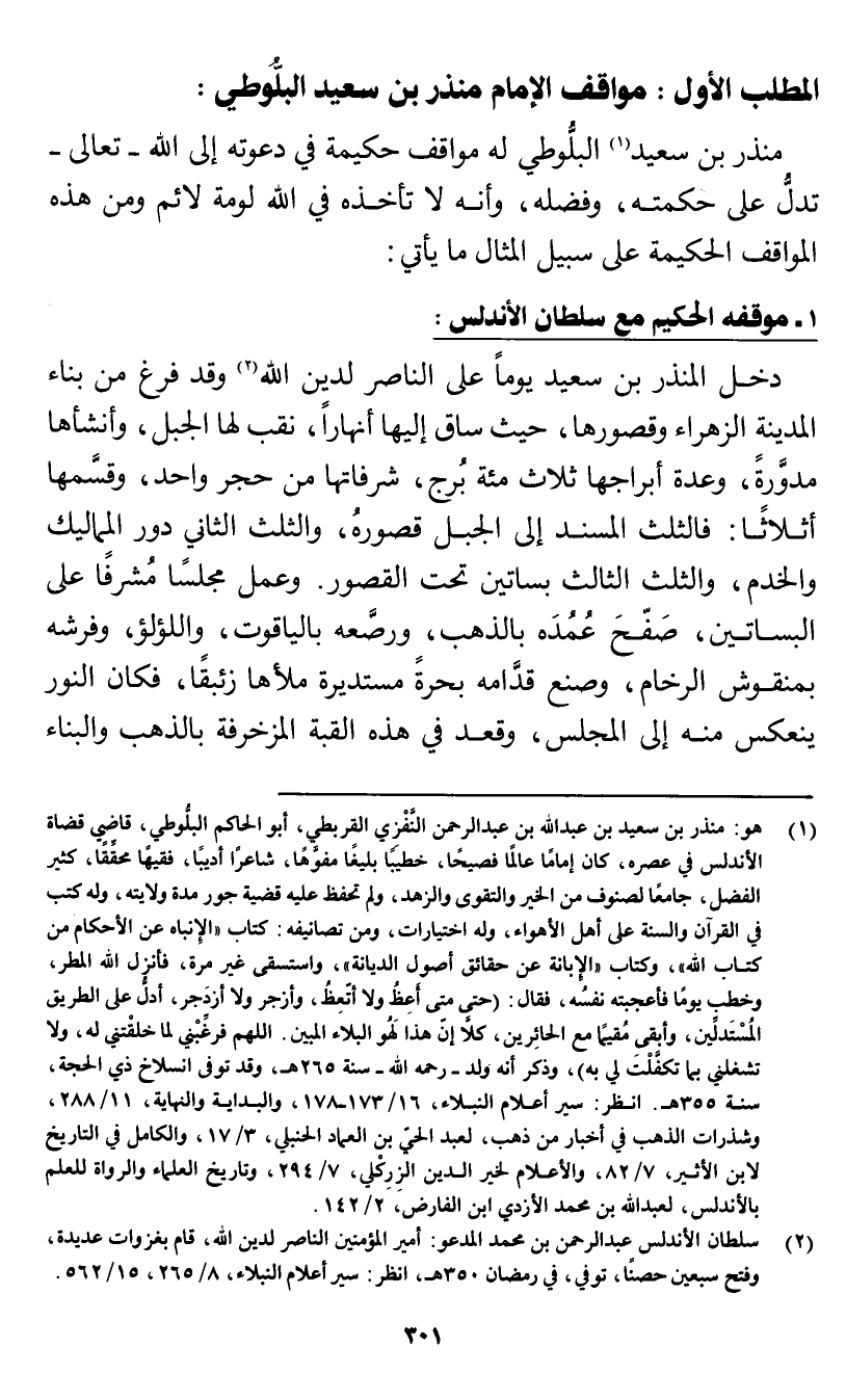 (¬1) هو: منذر بن سعيد بن عبد الله بن عبد الرحمن النَّفْزي القربطي، أبو الحاكم البلُّوطي، قاضي قضاة الأندلس في عصره، كان إمامًا عالمًا فصيحًا، خطيبًا بليغًا مفوهًا، شاعرًا أديبًا، فقيهًا محققًا، كثير الفضل، جامعًا لصنوف من الخير والتقوى والزهد، ولم تحفظ عليه قضية جور مدة ولايته، وله كتب في القرآن والسنة على أهل الأهواء، وله اختيارات، ومن تصانيفه: كتاب "الإنباه عن الأحكام من كتاب الله" وكتاب "الإبانة عن حقائق أصول الديانة "، واستسقى غير مرة، فأنزل الله المطر، وخطب يومًا فأعجبته نفسه، فقال: (حتى متى أعِظُ ولا أتعِظُ، وأزجر ولا أزدجر، أدلُّ على الطريق المستدلين، وأبقى مُقيمًا مع الحائِرين، كلا إن هذا لَهُو البلاء المبين. اللهم فرَغِّبْني لما خلقتني له، ولا تشغلني بما تكفَّلْتَ لي به)، وذكر أنه ولد -رحمه الله- سنة 265هـ، وقد توفى انسلاخ ذي الحجة، سنة 355هـ. انظر: سير أعلام النبلاء، 16/ 173 - 178، والبداية والنهاية، 11/ 288، وشذرات الذهب في أخبار من ذهب؛ لعبد الحي بن العماد الحنبلي، 3/ 17، والكامل في التاريخ لابن الأثير، 7/ 82، والأعلام لخير الدين الزِرِكْلي، 7/ 294، وتاريخ العلماء والرواة للعلم بالأندلس، لعبد الله بن محمد الأزدي بن الفارض، 2/ 142.