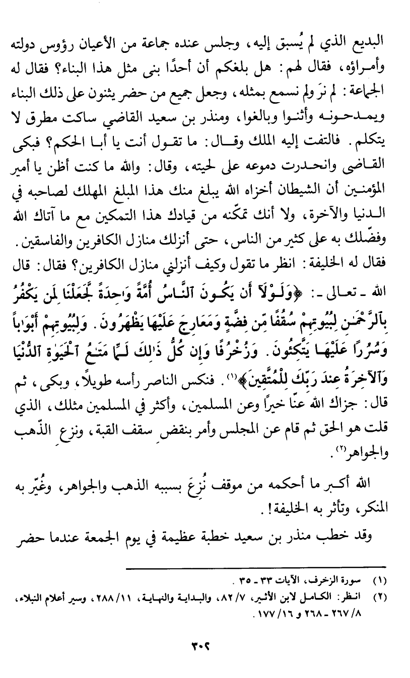 البديع الذي لم يسبق إليه، وجلس عنده جماعة من الأعيان رؤوس دولته وأمراؤه، فقال لهم: هل بلغكم أن أحدًا بنى مثل هذا البناء؟ فقال له الجماعة: لم نرَ ولم نسمع بمثله، وجعل جميع من حضر يثنون على ذلك البناء ويمدحونه وأثنوا وبالغوا، ومنذر بن سعيد القاضي ساكت مطرق لا يتكلم. فالتفت إليه الملك وقال: ما تقول أنت يا أبا الحكم؟ فبكى القاضي وانحدرت دموعه على لحيته، وقال: والله ما كنت أظن يا أمير المؤمنين أن الشيطان أخزاه الله يبلغ منك هذا المبلغ المهلك لصاحبه في الدنيا والآخرة، ولا أنك تمكِّنه من قيادك هذا التمكين مع ما آتاك الله وفضَّلك به على كثير من الناس، حتى أنزلك منازل الكافرين والفاسقين. فقال له الخليفة: انظر ما تقول وكيف أنزلني منازل الكافرين؟ فقال: قال الله -تعالى-: {وَلَوْلَا أَنْ يَكُونَ النَّاسُ أُمَّةً وَاحِدَةً لَجَعَلْنَا لِمَنْ يَكْفُرُ بِالرَّحْمَنِ لِبُيُوتِهِمْ سُقُفًا مِنْ فَضَّةٍ وَمَعَارِجَ عَلَيْهَا يَظْهَرُونَ - وَلِبُيُوتِهِمْ أَبْوَابًا وَسُرُرًا عَلَيْهَا يَتَّكِئُونَ - وَزُخْرُفًا وَإِنْ كُلُّ ذَلِكَ لَمَّا مَتَاعُ الْحَيَاةِ الدُّنْيَا وَالْآخِرَةُ عِنْدَ رَبِّكَ لِلْمُتَّقِينَ} [الزخرف: 33 - 35] (¬1) فنكس الناصر رأسه طويلًا، وبكى، ثم قال: جزاك الله عنَّا خيرًا وعن المسلمين، وأكثر في المسلمين مثلك، الذي قلت هو الحق ثم قام عن المجلس وأمر بنقض سقف القبة، ونزع الذهب والجواهر (¬2).