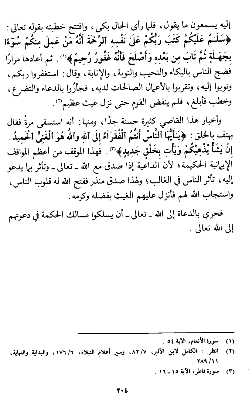 وأخبار هذا القاضي كثيرة حسنة جدًّا، ومنها: أنه استسقى مرةً فقال يهتف بالخلق: {يَا أَيُّهَا النَّاسُ أَنْتُمُ الْفُقَرَاءُ إِلَى اللَّهِ وَاللَّهُ هُوَ الْغَنِيُّ الْحَمِيدُ - إِنْ يَشَأْ يُذْهِبْكُمْ وَيَأْتِ بِخَلْقٍ جَدِيدٍ} [فاطر: 15 - 16] (¬3) فهذا الموقف من أعظم المواقف الإيمانية الحكيمة؟ لأن الداعية إذا صدق مع الله- تعالى- وتأثر بما يدعو إليه، تأثر الناس في الغالب؟ ولهذا صدق منذر ففتح الله له قلوب الناس، واستجاب الله لهم فأنزل عليهم الغيث بفضله وكرمه.