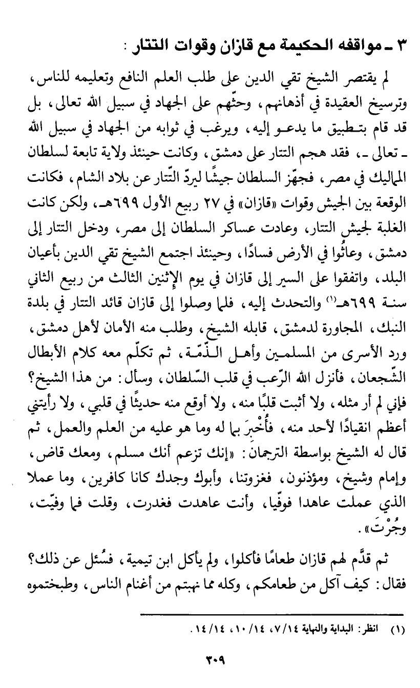 3 - مواقفه الحكيمة مع قازان وقوات التتار: لم يقتصر الشيخ تقي الدين على طلب العلم النافع وتعليمه للناس، وترسيخ العقيدة في أذهانهم، وحثِّهم على الجهاد في سبيل الله تعالى، بل قد قام بتطبيق ما يدعو إليه، ويرغب في ثوابه من الجهاد في سبيل الله -تعالى-، فقد هجم التتار على دمشق، وكانت حينئذ ولاية تابعة لسلطان المماليك في مصر، فجهَّز السلطان جيشًا ليرد التتار عن بلاد الشام، فكانت الوقعة بين الجيش وقوات " قازان " في 27 ربيع الأول 699هـ، ولكن كانت الغلبة لجيشي التتار، وعادت عساكر السلطان إلى مصر، ودخل التتار إلى دمشق، وعاثوا في الأرض فسادًا، وحينئذ اجتمع الشيخ تقي الدين بأعيان البلد، واتفقوا على السير إلى قازان في يوم الاثنين الثالث من ربيع الثاني سنة 699هـ (¬1) والتحدث إليه، فلما وصلوا إلى قازان قائد التتار في بلدة النبك، المجاورة لدمشق، قابله الشيخ، وطلب منه الأمان لأهل دمشق، ورد الأسرى من المسلمين وأهل الذمة، ثم تكلم معه كلام الأبطال الشجعان، فأنزل الله الرعب في قلب السلطان، وسأل: من هذا الشيخ؟ فإني لم أرَ مثله، ولا أثبت قلبًا منه، ولا أوقع منه حديثًا في قلبي، ولا رأيتني أعظم انقيادًا لأحد منه، فأُخْبِر بما له وما هو عليه من العلم والعمل، ثم قال له الشيخ بواسطة الترجمان: "إنك تزعم أنك مسلم، ومعك قاض، وإمام وشيخ، ومؤذنون، فغزوتنا، وأبوك وجدك كانا كافرين، وما عملا الذي عملت عاهدا فوَفَّيَا، وأنت عاهدت فغدرت، وقلت فما وفيت، وجُرْت".