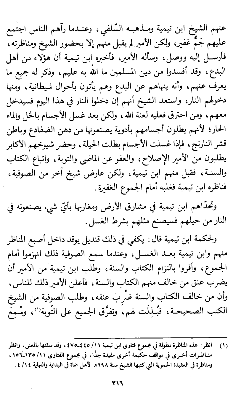 عنهم الشيخ ابن تيمية ومذهبه السلفي، وعندما رآهم الناس اجتمع عليهم جمٌّ غفير، ولكن الأمير لم يقبل منهم إلا بحضور الشيخ ومناظرته، فأرسل إليه ووصل، وسأله الأمير، فأخبره ابن تيمية أن هؤلاء من أهل البدع، وقد أفسدوا من دين المسلمين ما الله به عليم، وذكر له جميع ما يعرف عنهم، وأنه ينهاهم عن البدع وهم يأتون بأحوال شيطانية، ومنها دخولهم النار، واستعد الشيخ أنهم إن دخلوا النار في هذا اليوم فسيدخل معهم، ومن احترق فعليه لعنة الله، ولكن بعد غسل الأجسام بالخل والماء الحار؟ لأنهم يطلون أجسامهم بأدوية يصنعونها من دهن الضفادع وباطن قشر النارنج، فإذا غسلت الأجسام بطلت الحيلة، وحضر شيوخهم الأكابر يطلبون من الأمير الإصلاح، والعفو عن الماضي والتوبة، واتباع الكتاب والسنة، فقبل منهم ابن تيمية، ولكن عارض شيخ آخر من الصوفية، فناظره ابن تيمية فغلبه أمام الجموع الغفيرة.