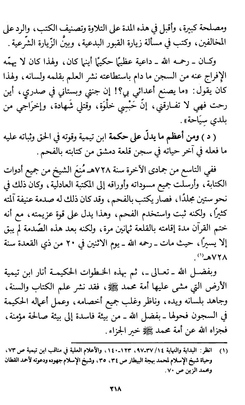 (د) ومن أعظم ما يدل على حكمة ابن تيمية وقوَّته في الحق وثباته عليه ما فعله في آخر حياته في سجن قلعة دمشق من كتابته بالفحم.