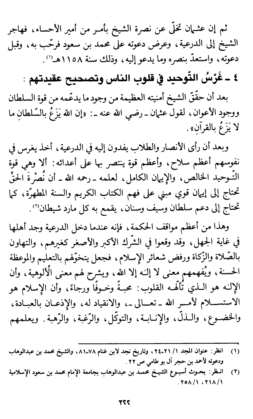 وبعد أن رأى الأنصار والطلاب يفدون إليه في الدرعية، أخذ يغرس في نفوسهم أعظم سلاح، وأعظم قوة ينتصر بها على أعدائه: ألا وهي قوة التوحيد الخالص، والإيمان الكامل، لعلمه -رحمه الله- أن نصرة الحق تحتاج إلى إيمان قوي مبني على فَهْم الكتاب الكريم والسنة المطهّرة، كما تحتاج إلى دعم سلطان وسيف وسنان، يقمع به كل مارد شيطان (¬2).