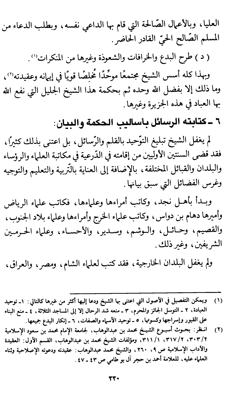 6 - كتابته الرسائل بأساليب الحكمة والبيان: لم يغفل الشيخ تبليغ التوحيد بالقلم والرسائل، بل اعتنى بذلك كثيرًا، فقد قضى السنتين الأوليين من إقامته في الدرعية في مكاتبة العلماء والرؤساء والبلدان والقبائل المختلفة، بالإضافة إلى العناية بالتربية والتعليم والتوجيه وغرس الفضائل التي سبق بيانها.