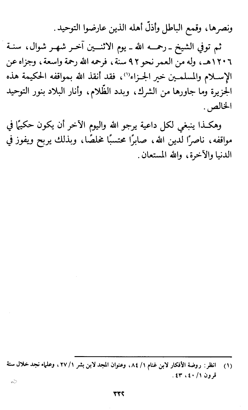 ثم توفي الشيخ -رحمه الله- يوم الاثنين آخر شهر شوال، سنة 1206هـ، وله من العمر نحو 92 سنة، فرحمه الله رحمة واسعة، وجزاه عن الإسلام والمسلمين خير الجزاء (¬1) فقد أنقذ الله بمواقفه الحكيمة هذه الجزيرة وما جاورها من الشرك، وبدل الظلام، وأنار البلاد بنور التوحيد الخالص.