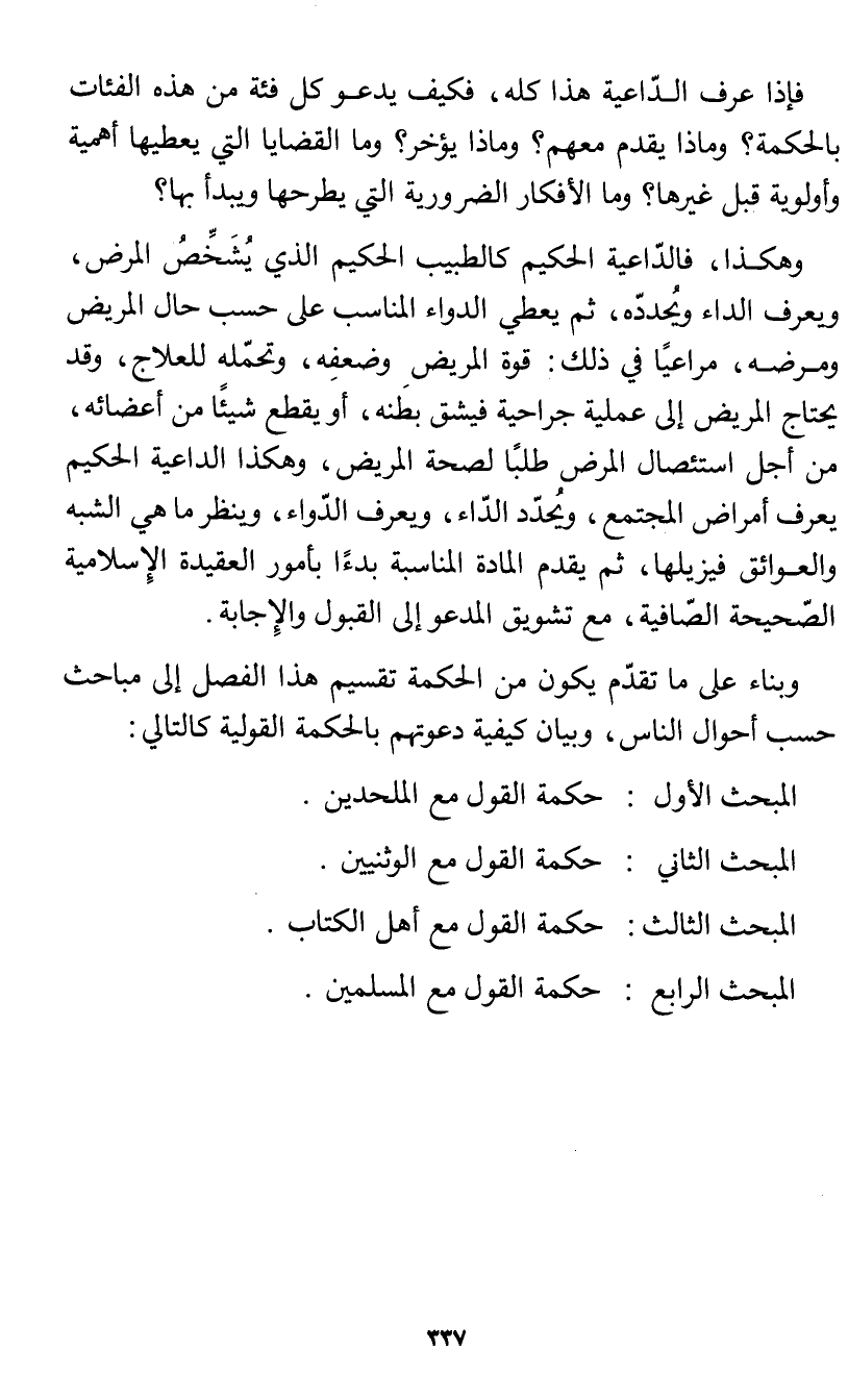 وبناء على ما تقدم يكون من الحكمة تقسيم هذا الفصل إلى مباحث حسب أحوال الناس، وبيان كيفية دعوتهم بالحكمة القولية كالتالي: