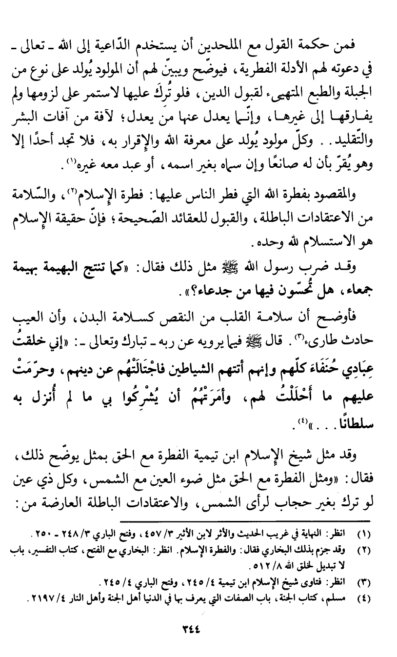 فأوضح أن سلامة القلب من النقص كسلامة البدن، وأن العيب حادث طارئ (¬3). قال صلى الله عليه وسلم فيما يرويه عن ربه -تبارك وتعالى-: «إني خلقت عبادي حُنَفاء كلهم وإنهم أتتهم الشياطين فاجْتَالَتْهُم عن دينهم، وحرَّمَت عليهم ما أحللت لهم، وأمرتهم أن يشركوا بي ما لم أنزل به سلطانًا». . . " (¬4).