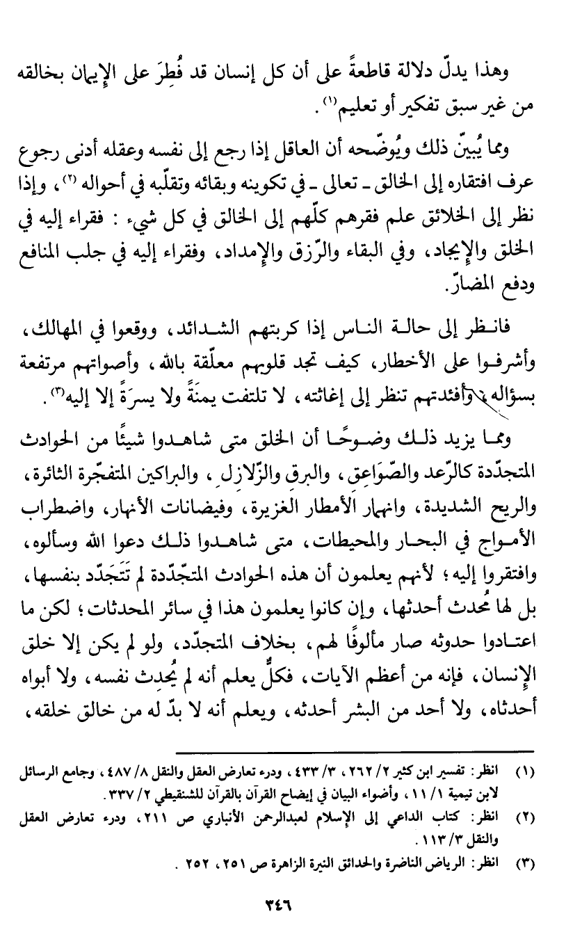 ومما يزيد ذلك وضوحًا أن الخلق متى شاهدوا شيئًا من الحوادث المتجددة كالرعد والصواعق، والبرق والزلازل، والبراكين المتفجرة الثائرة، والريح الشديدة، وانهمار الأمطار الغزيرة، وفيضانات الأنهار، واضطراب الأمواج في البحار والمحيطات، متى شاهدوا ذلك دعوا الله وسألوه، وافتقروا إليه، لأنهم يعلمون أن هذه الحوادث المتجددة لم تتجدّد بنفسها، بل لها محدث أحدثها، وإن كانوا يعلمون هذا في سائر المحدثات؛ لكن ما اعتادوا حدوثه صار مألوفًا لهم، بخلاف المتجدّد، ولو لم يكن إلا خلق الإنسان، فإنه من أعظم الآيات، فكل يعلم أنه لم يحدث نفسه، ولا أبواه أحدثاه، ولا أحد من البشر أحدثه، ويعلم أنه لا بد له من خالق خلقه،