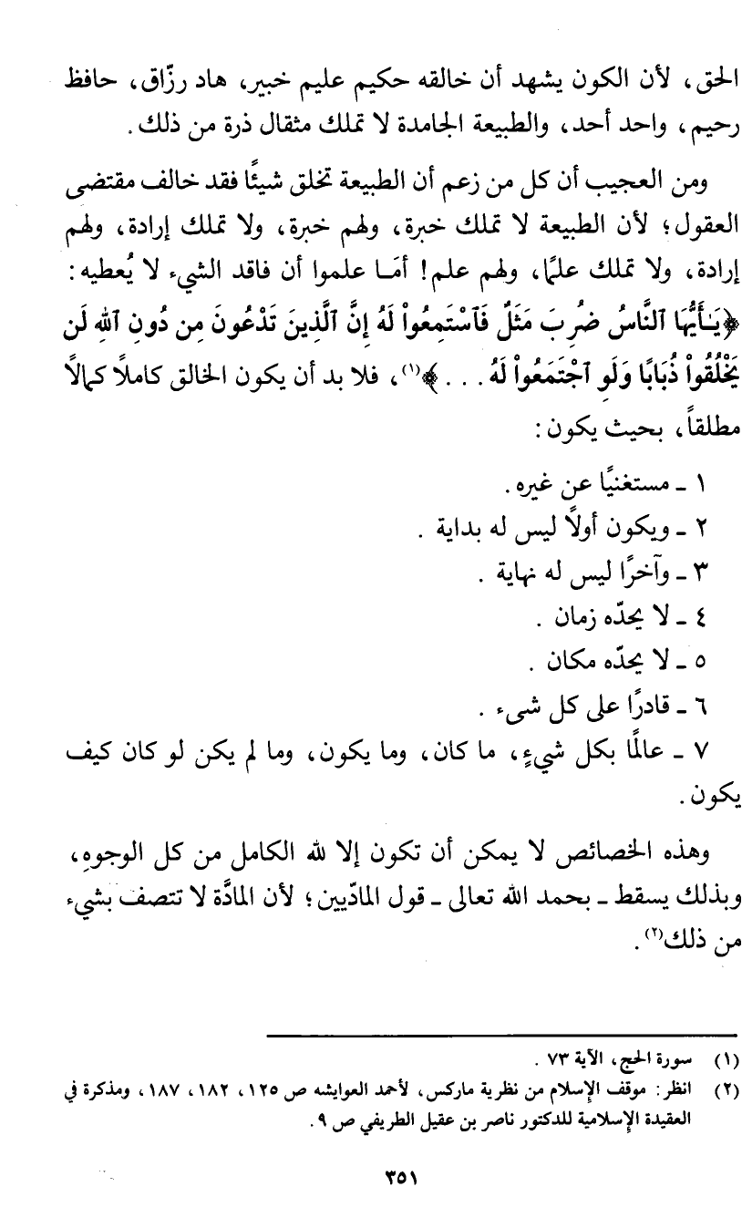 وهذه الخصائص لا يمكن أن تكون إلا لله الكامل من كل الوجوه، وبذلك يسقط -بحمد الله تعالى- قول الماديين؛ لأن المادة لا تتصف بشيء من ذلك (¬2).