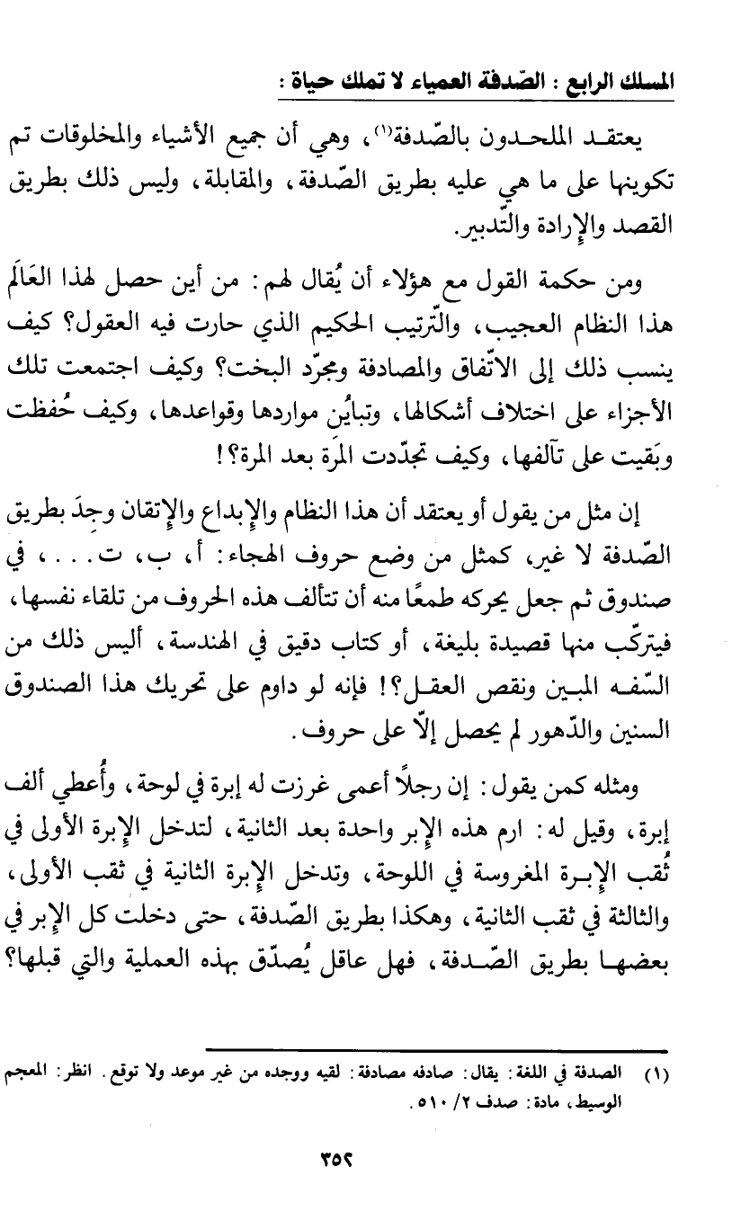 إن مثل من يقول أو يعتقد أن هذا النظام والإبداع والإتقان وُجِدَ بطريق الصدفة لا غير، كمثل من وضع حروف الهجاء: أ، ب، ت. . .، في صندوق ثم جعل يحركه طمعًا منه أن تتألف هذه الحروف من تلقاء نفسها، فيتركب منها قصيدة بليغة، أو كتاب دقيق في الهندسة، أليس ذلك من السفه المبين ونقص العقل؟! فإنه لو داوم على تحريك هذا الصندوق السنين والدهور لم يحصل إلا على حروف.
