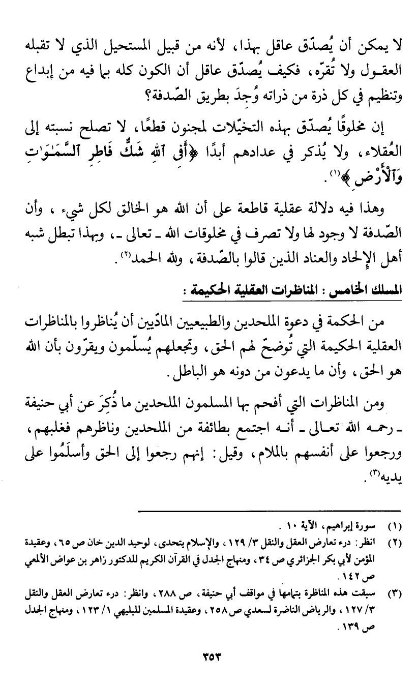 (¬2) انظر: درء تعارض العقل والنقل 3/ 129، والإسلام يتحدى، لوحيد الدين خان ص65، وعقيدة المؤمن لأبي بكر الجزائري ص34، ومنهاج الجدل في القرآن الكريم للدكتور زاهر بن عواض الألمعي ص142.