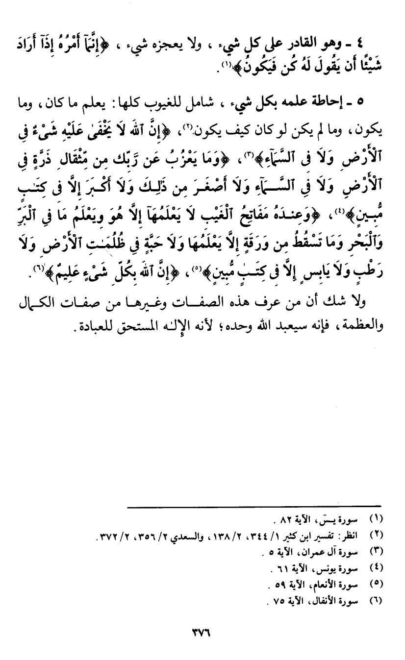 4 - وهو القادر على كل شيء، ولا يعجزه شيء، {إِنَّمَا أَمْرُهُ إِذَا أَرَادَ شَيْئًا أَنْ يَقُولَ لَهُ كُنْ فَيَكُونُ} [يس: 82] (¬1).