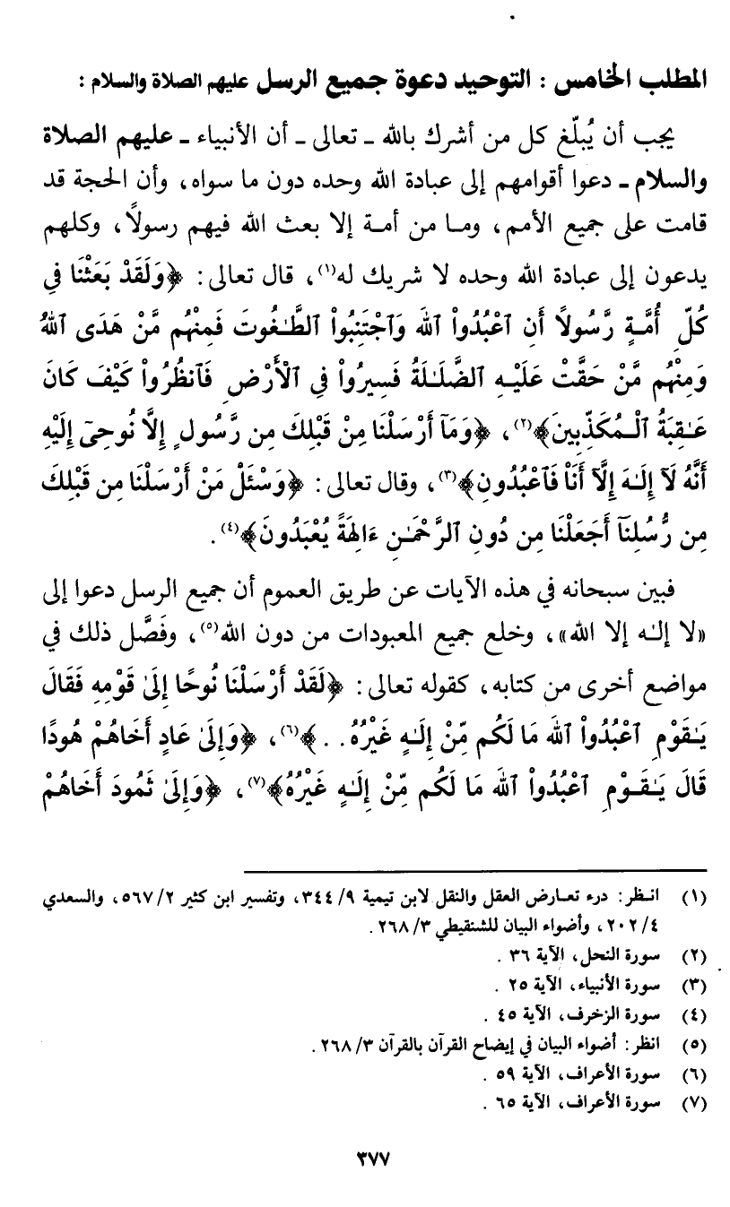 فبين سبحانه في هذه الآيات عن طريق العموم أن جميع الرسل دعوا إلى "لا إله إلا الله"، وخلع جميع المعبودات من دون الله (¬5) وفصَّل ذلك في مواضع أخرى من كتابه، كقوله تعالى: {لَقَدْ أَرْسَلْنَا نُوحًا إِلَى قَوْمِهِ فَقَالَ يَا قَوْمِ اعْبُدُوا اللَّهَ مَا لَكُمْ مِنْ إِلَهٍ غَيْرُهُ} [الأعراف: 59] (¬6) {وَإِلَى عَادٍ أَخَاهُمْ هُودًا قَالَ يَا قَوْمِ اعْبُدُوا اللَّهَ مَا لَكُمْ مِنْ إِلَهٍ غَيْرُهُ} [الأعراف: 65] (¬7) {وَإِلَى ثَمُودَ أَخَاهُمْ صَالِحًا قَالَ يَا قَوْمِ اعْبُدُوا اللَّهَ مَا لَكُمْ مِنْ إِلَهٍ غَيْرُهُ} [الأعراف: 73] (¬8)