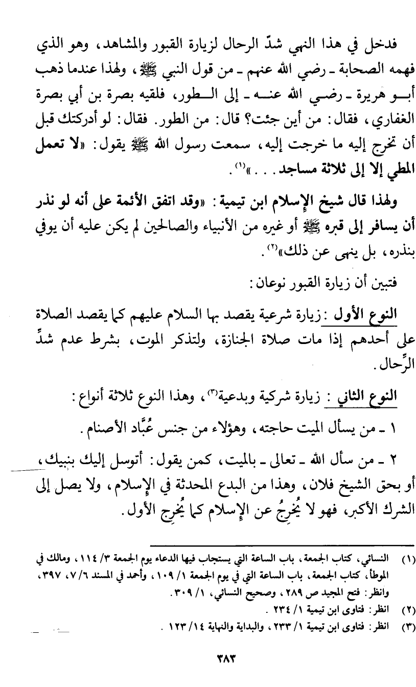 فدخل في هذا النهي شدّ الرحال لزيارة القبور والمشاهد، وهو الذي فهمه الصحابة -رضي الله عنهم- من قول النبي صلى الله عليه وسلم، ولهذا عندما أبو هريرة -رضي الله عنه- إلى الطور، فلقيه بصرة بن أبي بصرة الغفاري، فقال: من أين جئت؟ قال: من الطور. فقال: لو أدركتك قبل أن تخرج إليه ما خرجت إليه، سمعت رسول الله صلى الله عليه وسلم يقول. «لا تعمل المطي إلا إلى ثلاثة مساجد». . . " (¬1).