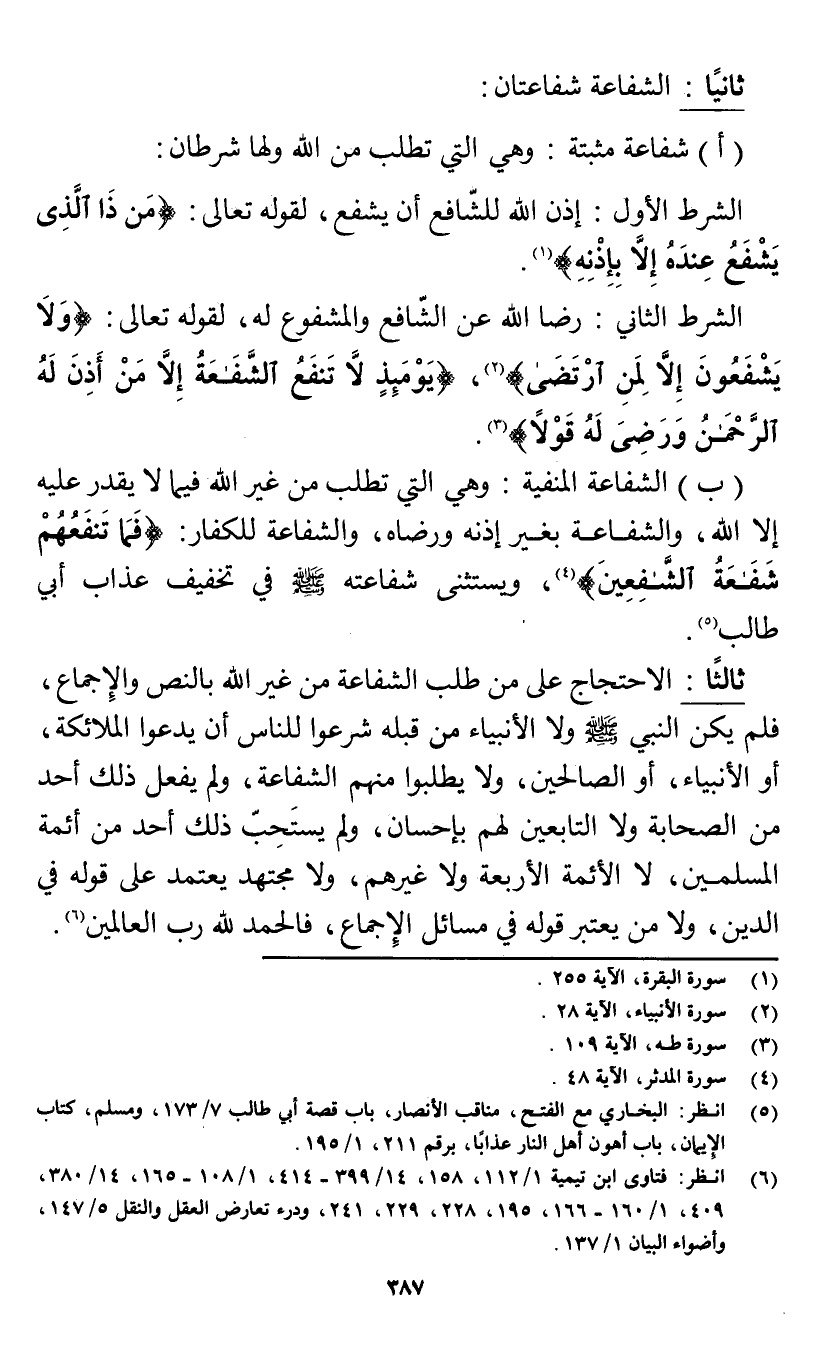 (ب) الشفاعة المنفية: وهي التي تطلب من غير الله فيما لا يقدر عليه إلا الله، والشفاعة بغير إذنه ورضاه، والشفاعة للكفار: {فَمَا تَنْفَعُهُمْ شَفَاعَةُ الشَّافِعِينَ} [المدثر: 48] (¬4) ويستثنى شفاعته صلى الله عليه وسلم في تخفيف عذاب أبي طالب (¬5).