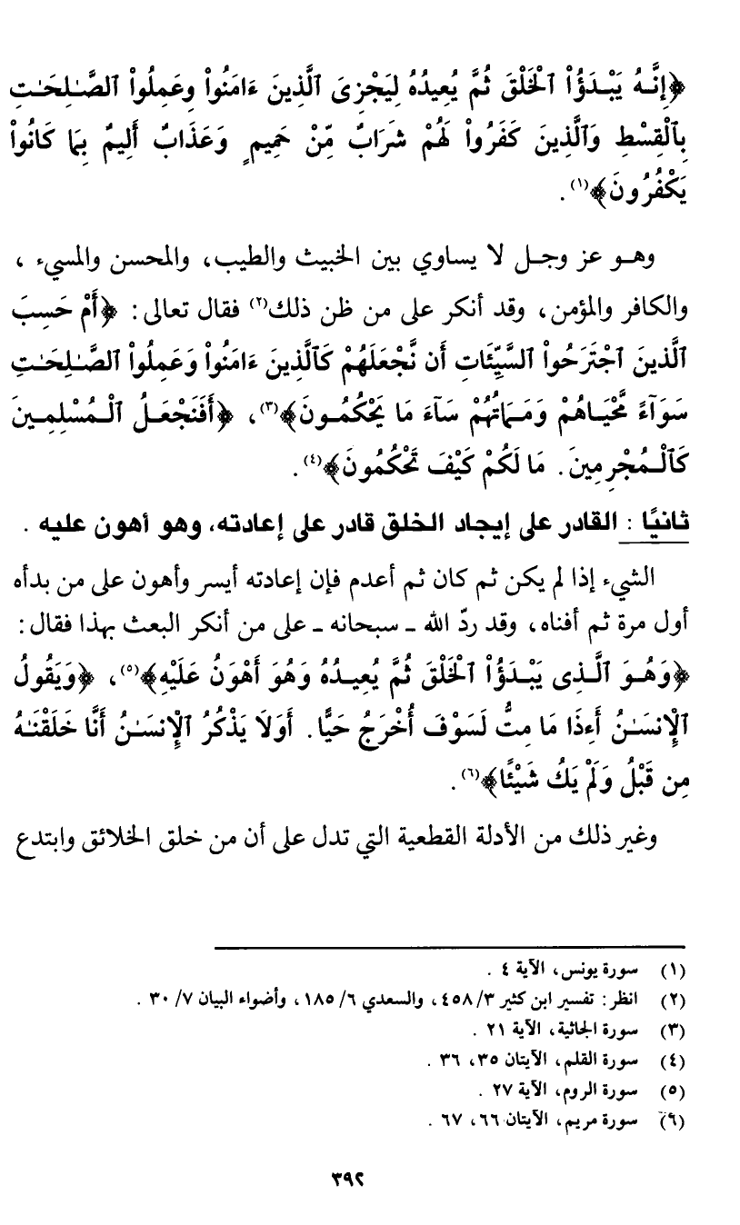 {إِنَّهُ يَبْدَأُ الْخَلْقَ ثُمَّ يُعِيدُهُ لِيَجْزِيَ الَّذِينَ آمَنُوا وَعَمِلُوا الصَّالِحَاتِ بِالْقِسْطِ وَالَّذِينَ كَفَرُوا لَهُمْ شَرَابٌ مِنْ حَمِيمٍ وَعَذَابٌ أَلِيمٌ بِمَا كَانُوا يَكْفُرُونَ} [يونس: 4] (¬1).