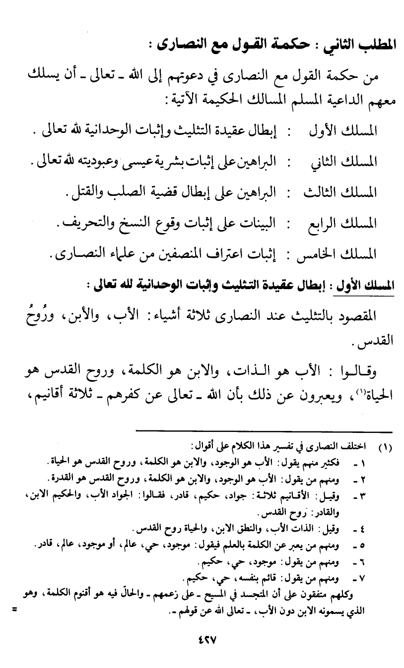 المسلك الأول: إبطال عقيدة التثليث وإثبات الوحدانية لله تعالى: المقصود بالتثليث عند النصارى ثلاثة أسماء: الآب، والابن، وروح القدس.