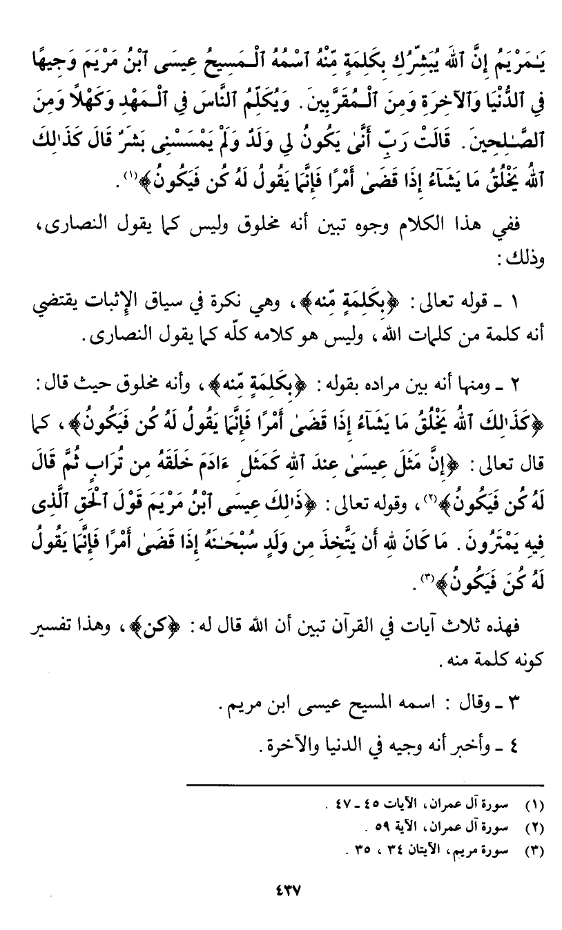 1 - قوله تعالى: {بِكَلِمَةٍ مِنْهُ} [آل عمران: 45] وهي نكرة في سياق الإثبات يقتضي أنه كلمة من كلمات الله، وليس هو كلامه كله كما يقول النصارى.