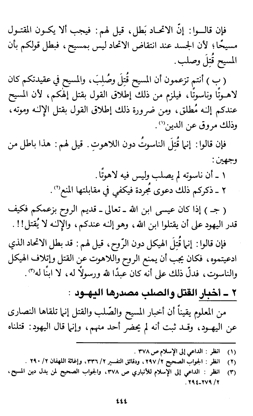 (ب) أنتم تزعمون أن المسيح قتل وصلب، والمسيح في عقيدتكم كان لاهوتا وناسوتا، فيلزم من ذلك إطلاق القول بقتل إلهكم؛ لأن المسيح عندكم إله مطلق، ومن ضرورة ذلك إطلاق القول بقتل الإله وموته، وذلك مروق عن الدين (¬1).