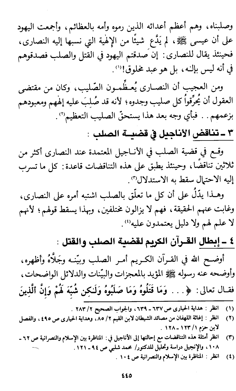 4 - إبطال القرآن الكريم لقضية الصلب والقتل: أوضح الله في القرآن الكريم أمر الصلب وبينه وجلاه وأظهره، وأوضحه عنه رسوله صَلَّى اللَّهُ عَلَيْهِ وَسَلَّم المؤيد بالمعجزات والبينات والدلائل الواضحات، فقال تعالى: