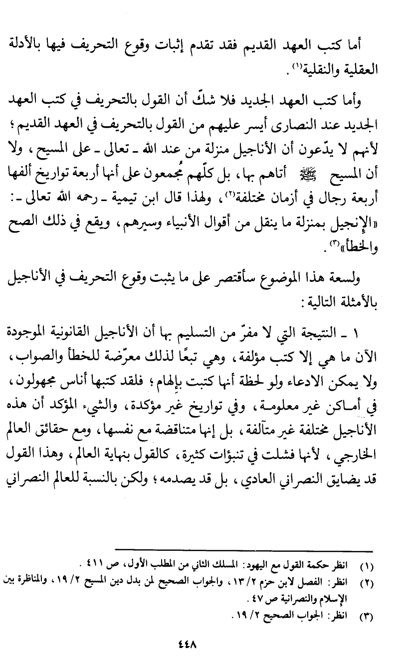 (¬2) انظر: الفصل لابن حزم 2/ 13، والجواب الصحيح لمن بدل دين المسيح 2/ 19، والمناظرة بين الإسلام والنصرانية ص 47.