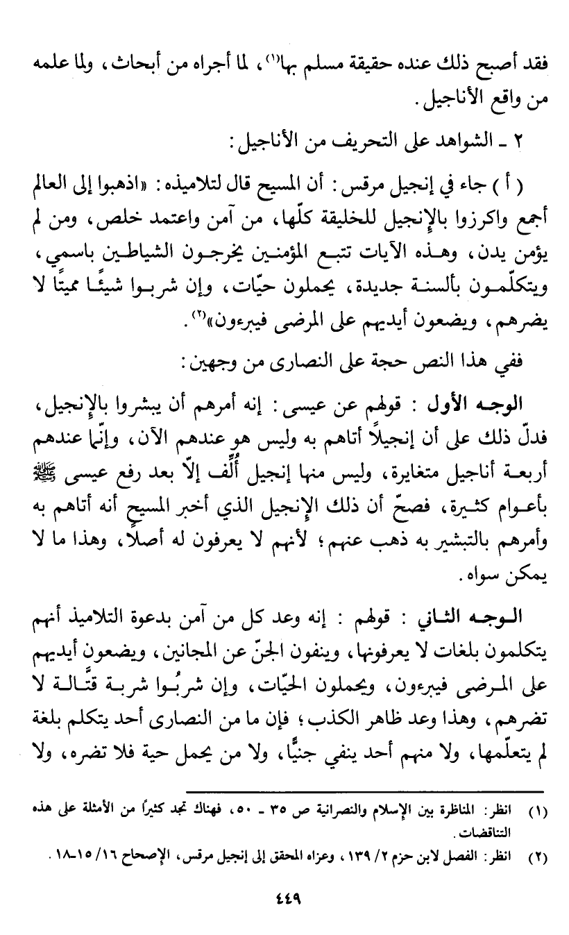 (¬2) انظر: الفصل لابن حزم 2/ 139، وعزاه المحقق إلى إنجيل مرقس، الإصحاح 16/ 15 - 18.
