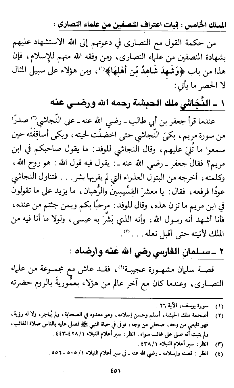 المسلك الخامس: إثبات اعتراف المنصفين من علماء النصارى: من حكمة القول مع النصارى في دعوتهم إلى الله الاستشهاد عليهم بشهادة المنصفين من علماء النصارى، ومن وفقه الله منهم للإسلام، فإن هذا من باب {وَشَهِدَ شَاهِدٌ مِنْ أَهْلِهَا} [يوسف: 26] (¬1) ومن هؤلاء على سبيل المثال لا الحصر ما يأتي: