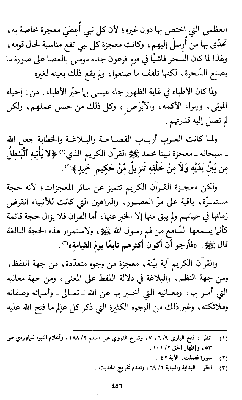 ولما كانت العرب أرباب الفصاحة والبلاغة والخطابة جعل الله - سبحانه- معجزة نبينا محمد صَلَّى اللَّهُ عَلَيْهِ وَسَلَّم القرآن الكريم الذي (¬1) {لَا يَأْتِيهِ الْبَاطِلُ مِنْ بَيْنِ يَدَيْهِ وَلَا مِنْ خَلْفِهِ تَنْزِيلٌ مِنْ حَكِيمٍ حَمِيدٍ} [فصلت: 42] (¬2).
