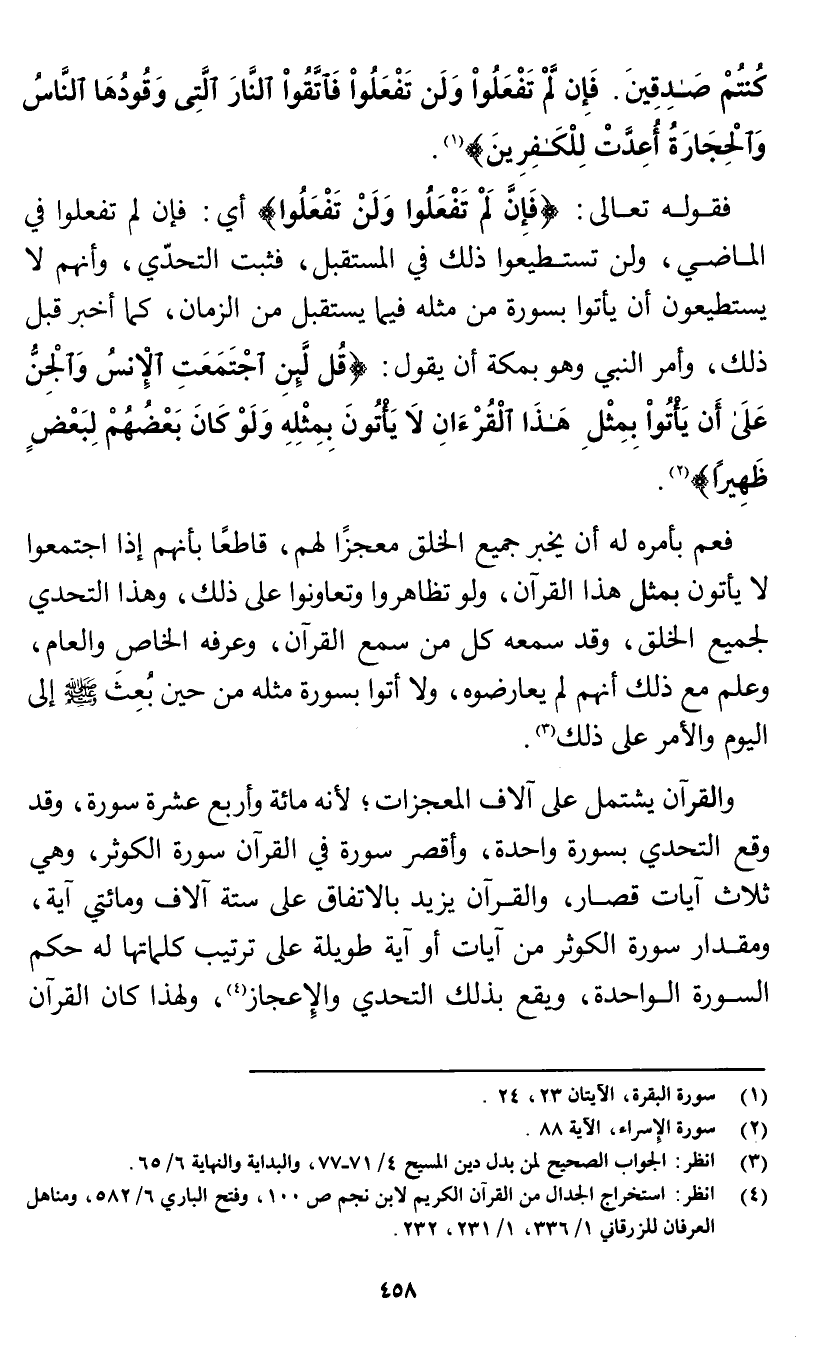 {وَإِنْ كُنْتُمْ فِي رَيْبٍ مِمَّا نَزَّلْنَا عَلَى عَبْدِنَا فَأْتُوا بِسُورَةٍ مِنْ مِثْلِهِ وَادْعُوا شُهَدَاءَكُمْ مِنْ دُونِ اللَّهِ إِنْ كُنْتُمْ صَادِقِينَ - فَإِنْ لَمْ تَفْعَلُوا وَلَنْ تَفْعَلُوا فَاتَّقُوا النَّارَ الَّتِي وَقُودُهَا النَّاسُ وَالْحِجَارَةُ أُعِدَّتْ لِلْكَافِرِينَ} [البقرة: 23 - 24] (¬1).