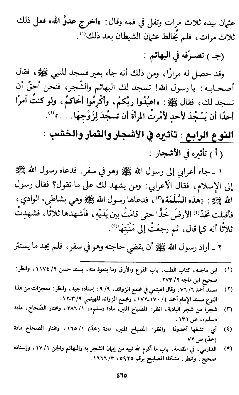 (جـ) تصرفه في البهائم: وقد حصل له مرارا، ومن ذلك أنه «جاء بعير، فسجد للنبي صَلَّى اللَّهُ عَلَيْهِ وَسَلَّم، فقال أصحابه: يا رسول الله! تسجد لك البهائم والشجر، فنحن أحق أن نسجد لك، فقال صَلَّى اللَّهُ عَلَيْهِ وَسَلَّم: " اعبدوا ربكم, وأكرموا أخاكم, ولو كنت آمرا أحدا أن يسجد لأحد لأمرت المرأة أن تسجد لزوجها». . . " (¬2).