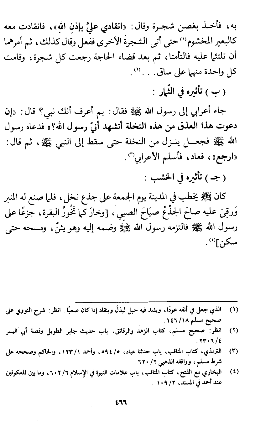 (ب) تأثيره في الثمار: «جاء أعرابي إلى رسول الله صَلَّى اللَّهُ عَلَيْهِ وَسَلَّم فقال: بم أعرف أنك نبي؟ قال. " إن دعوت هذا العذق من هذه النخلة أتشهد أن رسول الله؟ " فدعاه رسول الله صَلَّى اللَّهُ عَلَيْهِ وَسَلَّم فجعل ينزل من النخلة حتى سقط إلى النبي صَلَّى اللَّهُ عَلَيْهِ وَسَلَّم، ثم قال: " ارجع "، فعاد، فأسلم الأعرابي» (¬3).
