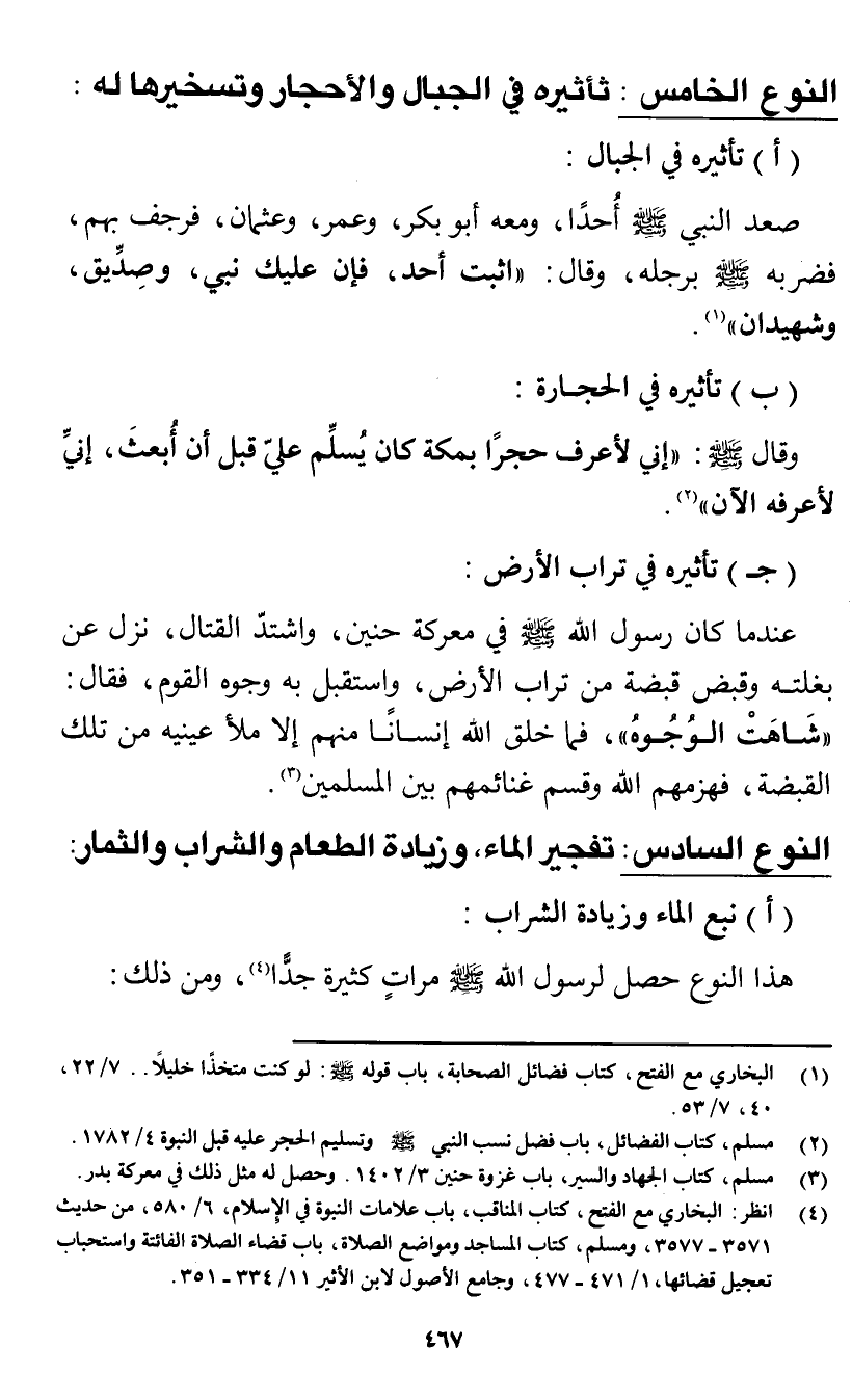 النوع الخامس: تأثيره في الجبال والأحجار وتسخيرها له: (أ) تأثيره في الجبال: «صعد النبي صَلَّى اللَّهُ عَلَيْهِ وَسَلَّم أحدا، ومعه أبو بكر، وعمر، وعثمان، فرجف بهم، فضربه صَلَّى اللَّهُ عَلَيْهِ وَسَلَّم برجله، وقال: " اثبت أحد، فإن عليك نبي، وصديق، وشهيدان» (¬1).