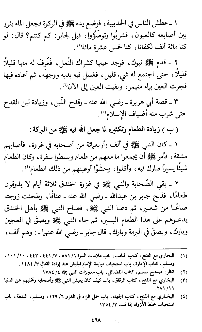 1 - «عطش الناس في الحديبية، فوضع يده صَلَّى اللَّهُ عَلَيْهِ وَسَلَّم في الركوة، فجعل الماء يثور بين أصابعه كالعيون، فشربوا، وتوضئوا، قيل لجابر: كم كنتم؟ قال: لو كنا مائة ألف لكفانا، كنا خمس عشرة مائة» (¬1).