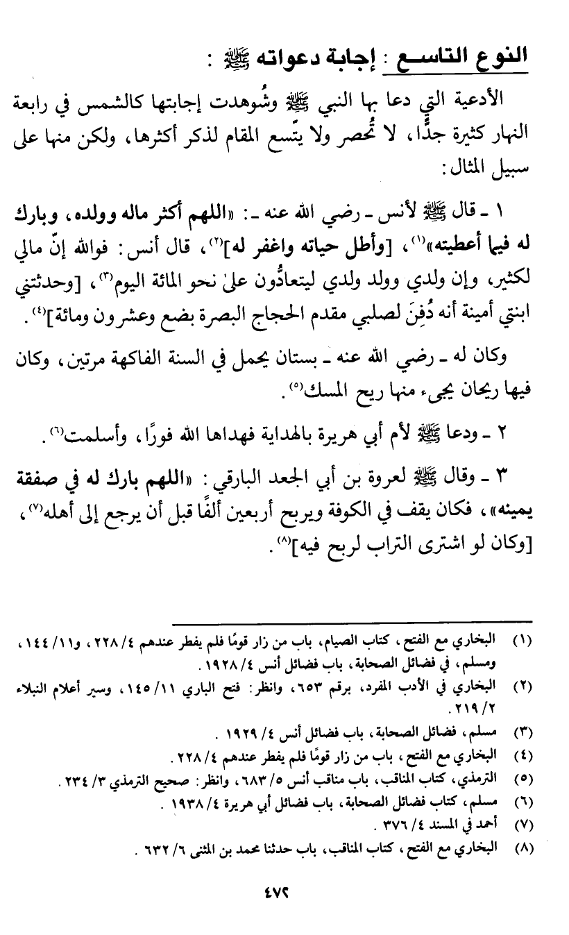 النوع التاسع: إجابة دعواته صَلَّى اللَّهُ عَلَيْهِ وَسَلَّم: الأدعية التي دعا بها النبي صَلَّى اللَّهُ عَلَيْهِ وَسَلَّم وشوهدت إجابتها كالشمس في رابعة النهار كثيرة جدا، لا تحصر، ولا يتسع المقام لذكر أكثرها، ولكن منها على سبيل المثال: