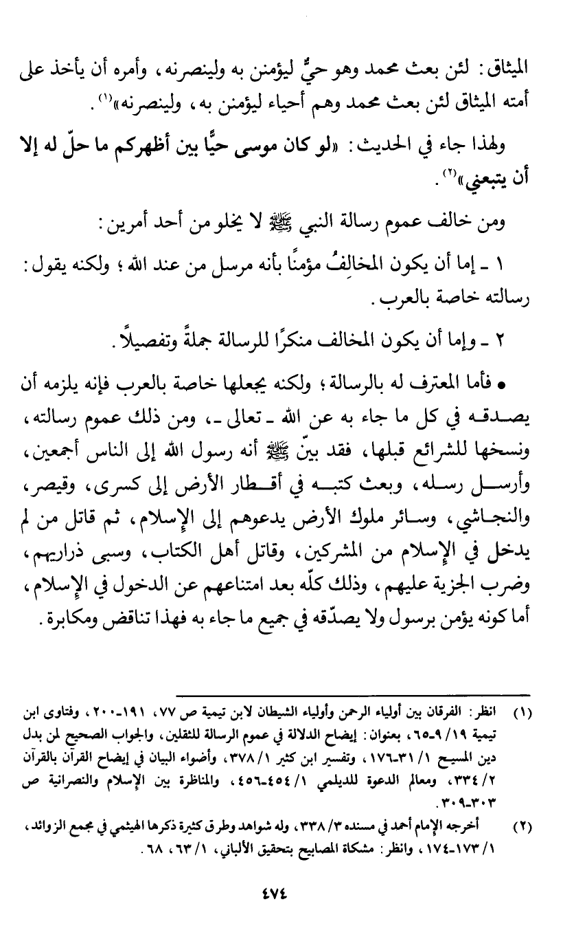 (¬1) انظر: الفرقان بين أولياء الرحمن وأولياء الشيطان لابن تيمية ص 77، 191 - 200، وفتاوى ابن تيمية 19/ 9 - 65، بعنوان: إيضاح الدلالة في عموم الرسالة للثقلين، والجواب الصحيح لمن بدل دين المسيح 1/ 31 - 176، وتفسير ابن كثير 1/ 378، وأضواء البيان في إيضاح القرآن بالقرآن 2/ 334، ومعالم الدعوة للديلمي 1/ 454 - 456، والمناظرة بين الإسلام والنصرانية ص 303 - 309.
