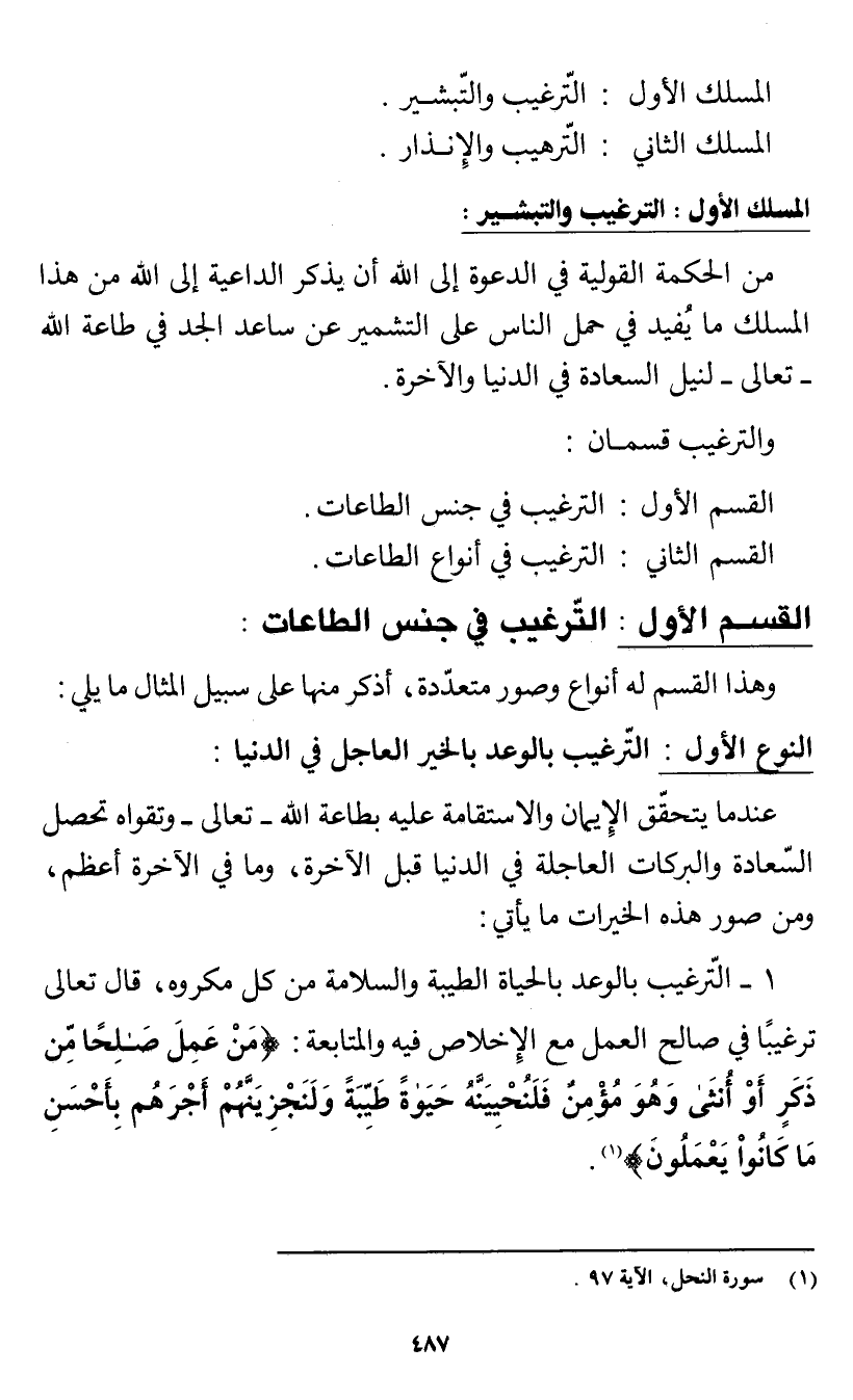 1 - الترغيب بالوعد بالحياة الطيبة والسلامة من كل مكروه، قال تعالى ترغيبا في صالح العمل مع الإخلاص فيه والمتابعة: {مَنْ عَمِلَ صَالِحًا مِنْ ذَكَرٍ أَوْ أُنْثَى وَهُوَ مُؤْمِنٌ فَلَنُحْيِيَنَّهُ حَيَاةً طَيِّبَةً وَلَنَجْزِيَنَّهُمْ أَجْرَهُمْ بِأَحْسَنِ مَا كَانُوا يَعْمَلُونَ} [النحل: 97] (¬1).