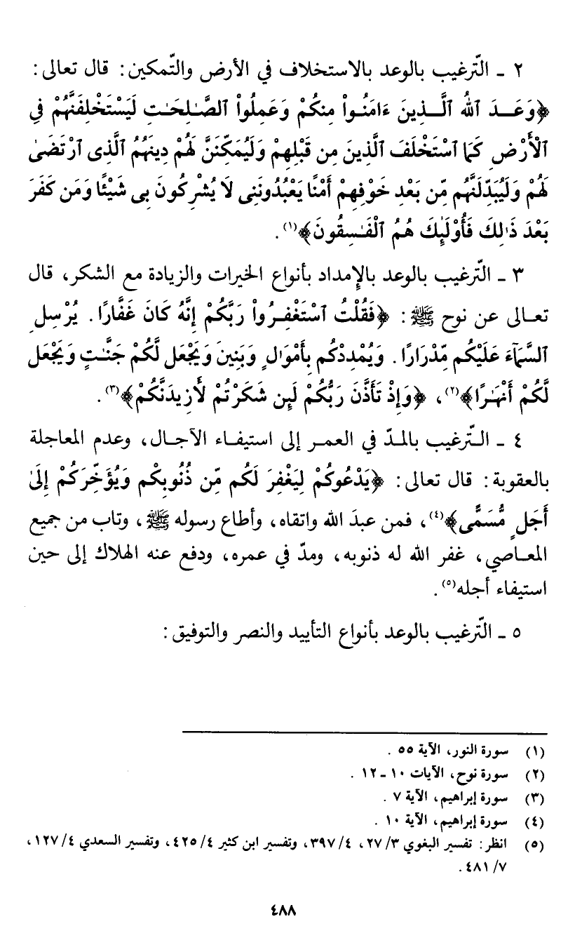 2 - الترغيب بالوعد بالاستخلاف في الأرض والتمكين: قال تعالى: {وَعَدَ اللَّهُ الَّذِينَ آمَنُوا مِنْكُمْ وَعَمِلُوا الصَّالِحَاتِ لَيَسْتَخْلِفَنَّهُمْ فِي الْأَرْضِ كَمَا اسْتَخْلَفَ الَّذِينَ مِنْ قَبْلِهِمْ وَلَيُمَكِّنَنَّ لَهُمْ دِينَهُمُ الَّذِي ارْتَضَى لَهُمْ وَلَيُبَدِّلَنَّهُمْ مِنْ بَعْدِ خَوْفِهِمْ أَمْنًا يَعْبُدُونَنِي لَا يُشْرِكُونَ بِي شَيْئًا وَمَنْ كَفَرَ بَعْدَ ذَلِكَ فَأُولَئِكَ هُمُ الْفَاسِقُونَ} [النور: 55] (¬1).