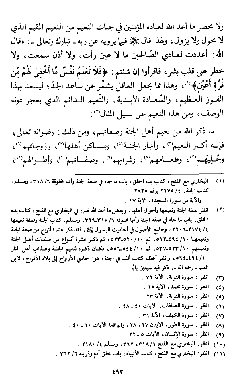 (¬2) انظر صفة الجنة ونعيمها وأحوال أهلها، وبعض ما أعد الله لهم، في البخاري مع الفتح، كتاب بدء الخلق، باب ما جاء في صفة الحنة وأنها مخلوقة 6/ 317 - 329، ومسلم، كتاب الجنة وصفة نعيمها 4/ 2174 - 2206، وجامع الأصول في أحاديث الرسول صَلَّى اللهُ عَلَيْهِ وَسَلَّم، فقد ذكر عشرة أنواع من صفة الجنة ونعيمها 10/ 494 - 512، ثم 10/ 520 - 523، ثم ذكر عشرة أنواع من صفات أهل الجنة ونعيمهم 10/ 523 - 537، ثم 10/ 544 - 556، فكان ذكره لنعيم الجنة وعذاب أهل النار 10/ 494 - 564، وانظر أعظم كتاب ألف في الجنة، هو حادي الأرواح إلى بلاد الأفراح، لابن القيم -رحمه الله-، ذكر فيه سبعين بابا.