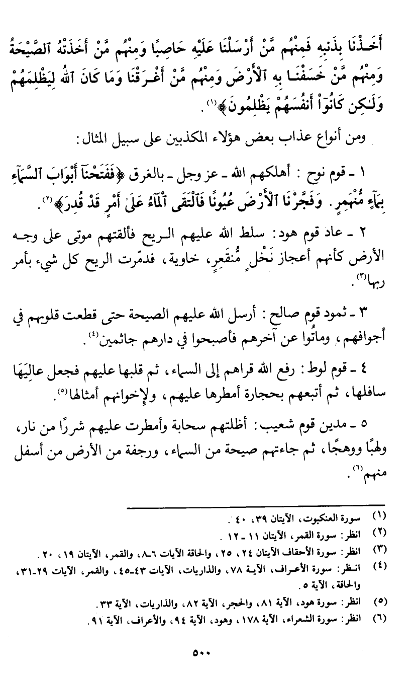 1 - قوم نوح: أهلكهم الله- عز وجل- بالغرق {فَفَتَحْنَا أَبْوَابَ السَّمَاءِ بِمَاءٍ مُنْهَمِرٍ - وَفَجَّرْنَا الْأَرْضَ عُيُونًا فَالْتَقَى الْمَاءُ عَلَى أَمْرٍ قَدْ قُدِرَ} [القمر: 11 - 12] (¬1) 2 - عاد قوم هود: سلط الله عليهم الريح فألقتهم موتى على وجه الأرض كأنهم أعجاز نخل منقعر، خاوية، فدمرت الريح كل شيء بأمر ربها (¬2) 3 - ثمود قوم صالح: أرسل الله عليهم الصيحة حتى قطعت قلوبهم في أجوافهم، وماتوا عن آخرهم فأصبحوا في دارهم جاثمين (¬3).