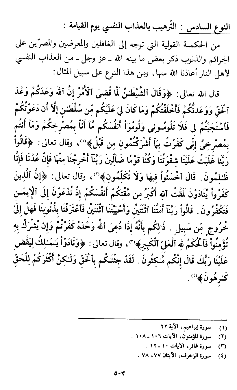 قال الله تعالى: {وَقَالَ الشَّيْطَانُ لَمَّا قُضِيَ الْأَمْرُ إِنَّ اللَّهَ وَعَدَكُمْ وَعْدَ الْحَقِّ وَوَعَدْتُكُمْ فَأَخْلَفْتُكُمْ وَمَا كَانَ لِي عَلَيْكُمْ مِنْ سُلْطَانٍ إِلَّا أَنْ دَعَوْتُكُمْ فَاسْتَجَبْتُمْ لِي فَلَا تَلُومُونِي وَلُومُوا أَنْفُسَكُمْ مَا أَنَا بِمُصْرِخِكُمْ وَمَا أَنْتُمْ بِمُصْرِخِيَّ إِنِّي كَفَرْتُ بِمَا أَشْرَكْتُمُونِي مِنْ قَبْلُ} [إبراهيم: 22] (¬1) وقال تعالى: {قَالُوا رَبَّنَا غَلَبَتْ عَلَيْنَا شِقْوَتُنَا وَكُنَّا قَوْمًا ضَالِّينَ - رَبَّنَا أَخْرِجْنَا مِنْهَا فَإِنْ عُدْنَا فَإِنَّا ظَالِمُونَ - قَالَ اخْسَئُوا فِيهَا وَلَا تُكَلِّمُونِ} [المؤمنون: 106 - 108] (¬2) وقال تعالى: {إِنَّ الَّذِينَ كَفَرُوا يُنَادَوْنَ لَمَقْتُ اللَّهِ أَكْبَرُ مِنْ مَقْتِكُمْ أَنْفُسَكُمْ إِذْ تُدْعَوْنَ إِلَى الْإِيمَانِ فَتَكْفُرُونَ - قَالُوا رَبَّنَا أَمَتَّنَا اثْنَتَيْنِ وَأَحْيَيْتَنَا اثْنَتَيْنِ فَاعْتَرَفْنَا بِذُنُوبِنَا فَهَلْ إِلَى خُرُوجٍ مِنْ سَبِيلٍ - ذَلِكُمْ بِأَنَّهُ إِذَا دُعِيَ اللَّهُ وَحْدَهُ كَفَرْتُمْ وَإِنْ يُشْرَكْ بِهِ تُؤْمِنُوا فَالْحُكْمُ لِلَّهِ الْعَلِيِّ الْكَبِيرِ} [غافر: 10 - 12] (¬3) وقال تعالى: {وَنَادَوْا يَا مَالِكُ لِيَقْضِ عَلَيْنَا رَبُّكَ قَالَ إِنَّكُمْ مَاكِثُونَ - لَقَدْ جِئْنَاكُمْ بِالْحَقِّ وَلَكِنَّ أَكْثَرَكُمْ لِلْحَقِّ كَارِهُونَ} [الزخرف: 77 - 78] (¬4).