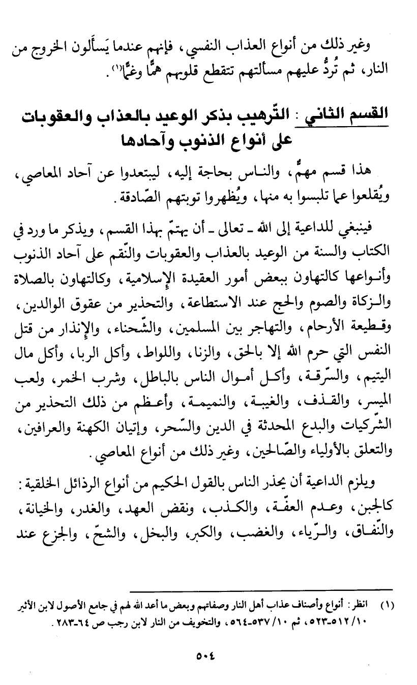 القسم الثاني: الترهيب بذكر الوعيد بالعذاب والعقوبات على أنواع الذنوب وآحادها هذا قسم مهم، والناس بحاجة إليه، ليبتعدوا عن آحاد المعاصي، ويقلعوا عما تلبسوا به منها، ويظهروا توبتهم الصادقة.