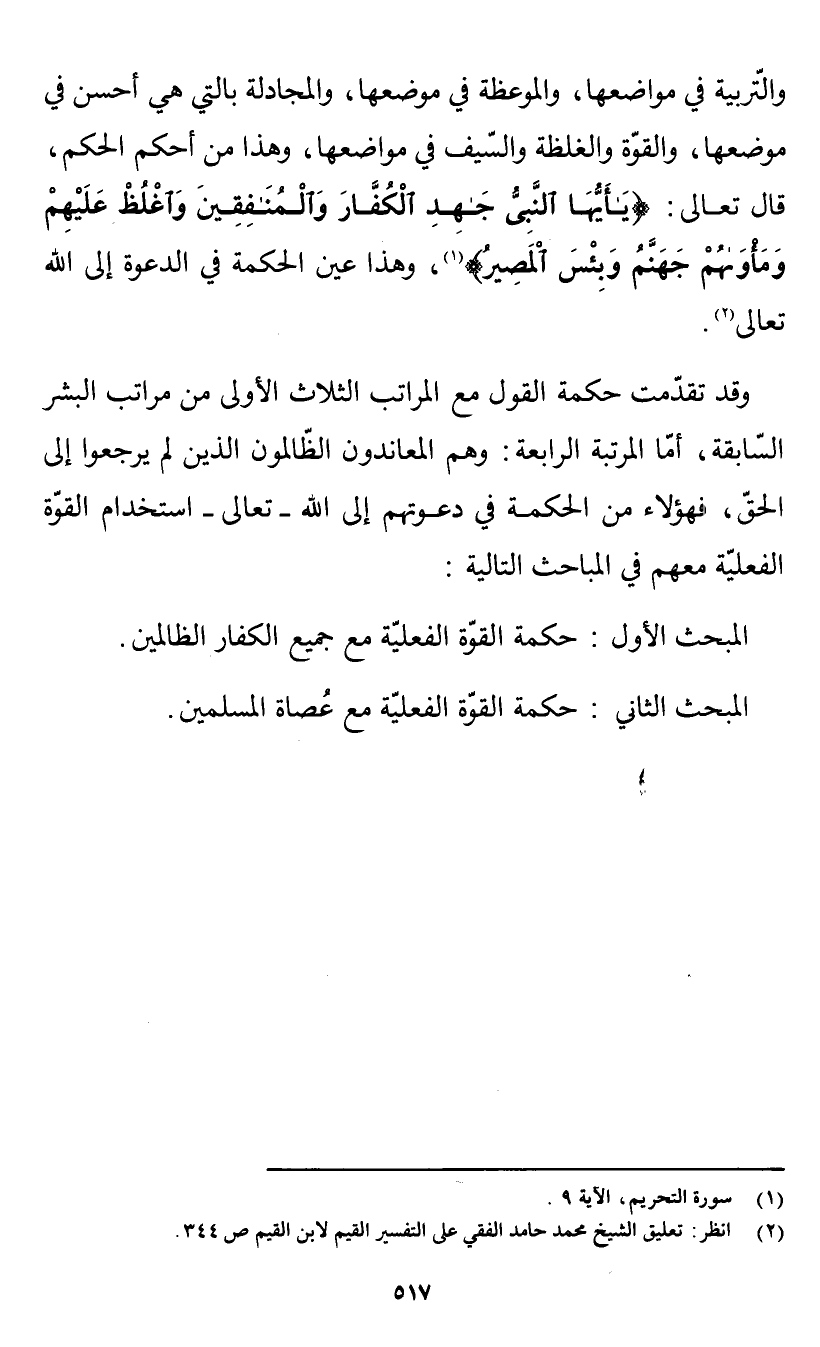 والتربية في مواضعها، والموعظة في موضعها، والمجادلة بالتي هي أحسن في موضعها، والقوة والغلظة والسيف في مواضعها، وهذا من أحكم الحكم، قال تعالى: {يَا أَيُّهَا النَّبِيُّ جَاهِدِ الْكُفَّارَ وَالْمُنَافِقِينَ وَاغْلُظْ عَلَيْهِمْ وَمَأْوَاهُمْ جَهَنَّمُ وَبِئْسَ الْمَصِيرُ} [التحريم: 9] (¬1) وهذا عين الحكمة في الدعوة إلى الله تعالى (¬2).