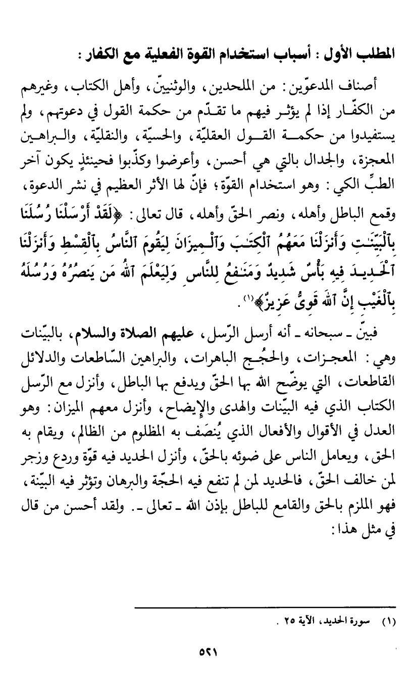 أصناف المدعوين: من الملحدين، والوثنيين، وأهل الكتاب، وغيرهم من الكفار إذا لم يؤثر فيهم ما تقدم من حكمة القول في دعوتهم، ولم يستفيدوا من حكمة القول العقلية، والحسية، والنقلية، والبراهين المعجزة، والجدال بالتي هي أحسن، وأعرضوا وكذبوا فحينئذ يكون آخر الطب الكي: وهو استخدام القوة؛ فإن لها الأثر العظيم في نشر الدعوة، وقمع الباطل وأهله، ونصر الحق وأهله، قال تعالى: {لَقَدْ أَرْسَلْنَا رُسُلَنَا بِالْبَيِّنَاتِ وَأَنْزَلْنَا مَعَهُمُ الْكِتَابَ وَالْمِيزَانَ لِيَقُومَ النَّاسُ بِالْقِسْطِ وَأَنْزَلْنَا الْحَدِيدَ فِيهِ بَأْسٌ شَدِيدٌ وَمَنَافِعُ لِلنَّاسِ وَلِيَعْلَمَ اللَّهُ مَنْ يَنْصُرُهُ وَرُسُلَهُ بِالْغَيْبِ إِنَّ اللَّهَ قَوِيٌّ عَزِيزٌ} [الحديد: 25] (¬1).