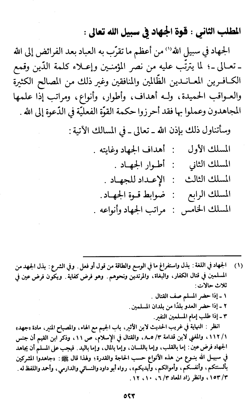 انظر: النهاية في غريب الحديث لابن الأثير، باب الجيم مع الهاء، والمصباح المنير، مادة "جهد" 1/ 112، والمغني لابن قدامة 3/ 5 - 8، والقتال في الإسلام، ص 11، وذكر ابن القيم أن جنس الجهاد فرض عين: إما بالقلب، وإما باللسان، وإما بالمال، وإما باليد. فيجب على المسلم أن يجاهد في سبيل الله بنوع من هذه الأنواع حسب الحاجة والقدرة؛ ولهذا قال صلى الله عليه وسلم: "جاهدوا المشركين بألسنتكم، وأنفسكم، وأموالكم، وأيديكم"، رواه أبو داود والنسائي والدارمي، وأحمد واللفظ له. 3/ 153، وانظر زاد المعاد 3/ 6، 10، 12.