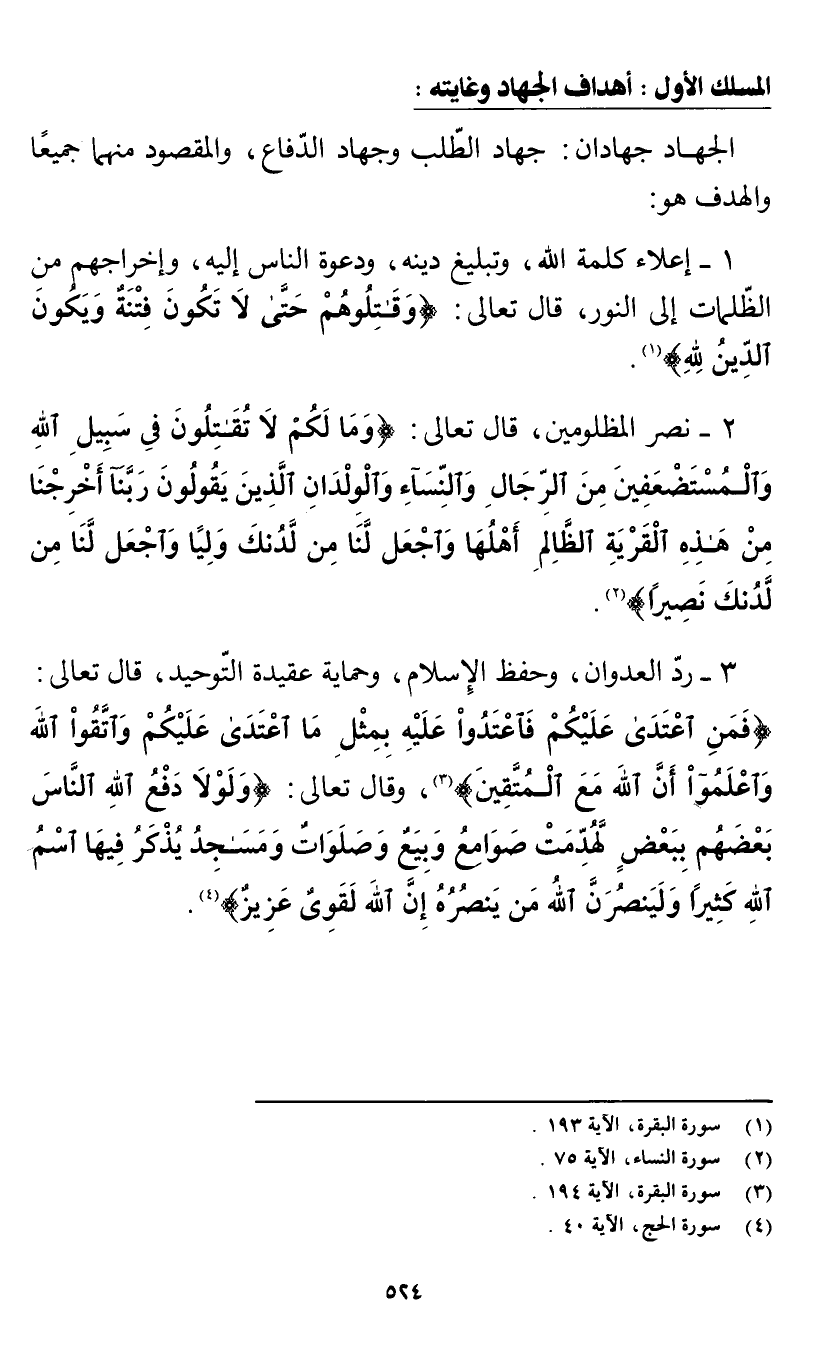 3 - رد العدوان، وحفظ الإسلام، وحماية عقيدة التوحيد، قال تعالى: {فَمَنِ اعْتَدَى عَلَيْكُمْ فَاعْتَدُوا عَلَيْهِ بِمِثْلِ مَا اعْتَدَى عَلَيْكُمْ وَاتَّقُوا اللَّهَ وَاعْلَمُوا أَنَّ اللَّهَ مَعَ الْمُتَّقِينَ} [البقرة: 194] (¬3) وقال تعالى: {وَلَوْلَا دَفْعُ اللَّهِ النَّاسَ بَعْضَهُمْ بِبَعْضٍ لَهُدِّمَتْ صَوَامِعُ وَبِيَعٌ وَصَلَوَاتٌ وَمَسَاجِدُ يُذْكَرُ فِيهَا اسْمُ اللَّهِ كَثِيرًا وَلَيَنْصُرَنَّ اللَّهُ مَنْ يَنْصُرُهُ إِنَّ اللَّهَ لَقَوِيٌّ عَزِيزٌ} [الحج: 40] (¬4).