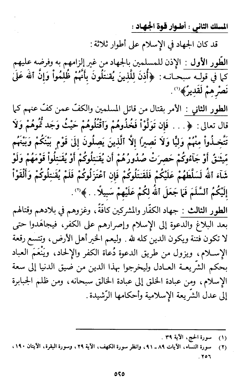 الطور الأول: الإذن للمسلمين بالجهاد من غير إلزامهم به وفرضه عليهم كما في قوله سبحانه: {أُذِنَ لِلَّذِينَ يُقَاتَلُونَ بِأَنَّهُمْ ظُلِمُوا وَإِنَّ اللَّهَ عَلَى نَصْرِهِمْ لَقَدِيرٌ} [الحج: 39] (¬1).